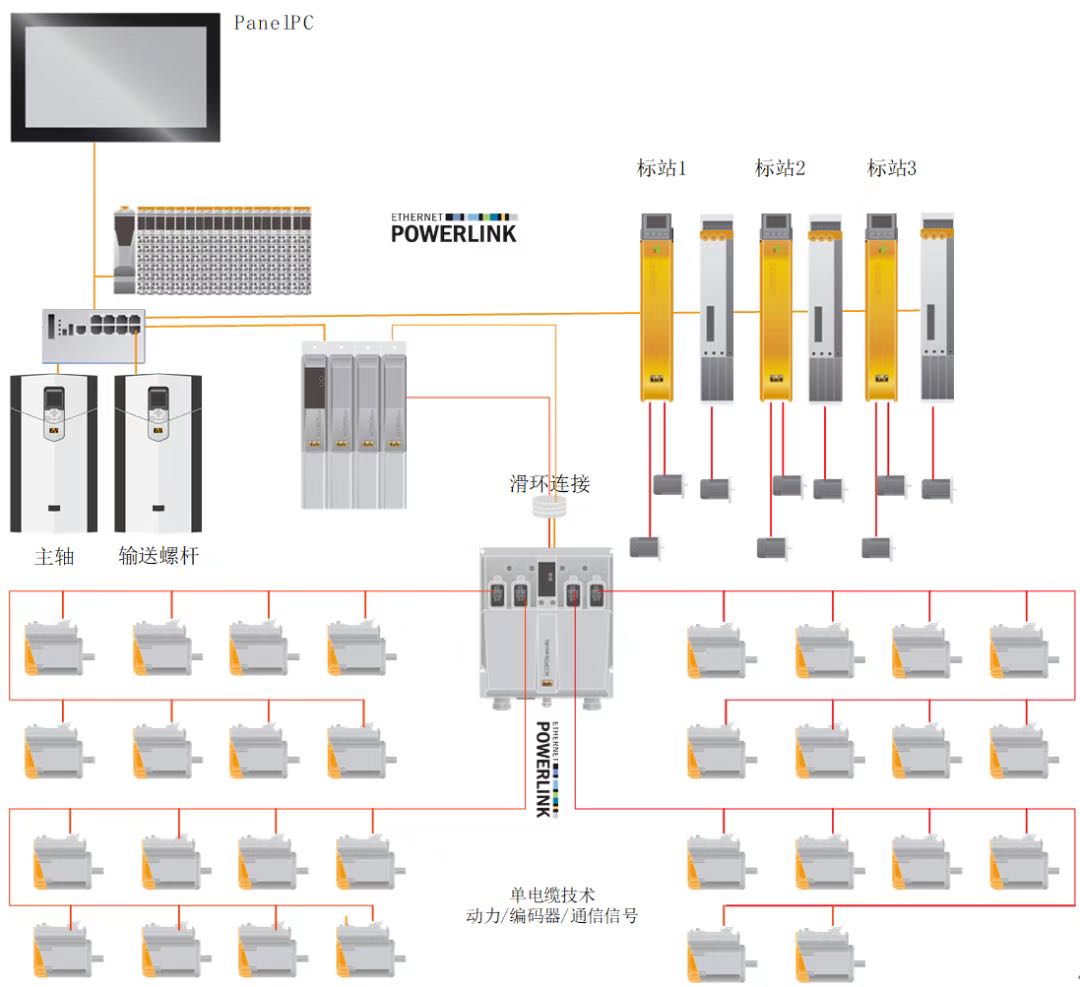 從圖5整個(gè)機(jī)器的配置可以看到,多達(dá)36個(gè)伺服電機(jī),其高速同步性,由POWERLINK實(shí)時(shí)網(wǎng)絡(luò)來保障,達(dá)到百微秒級(jí)的任務(wù)周期。而另一方面采用ACOPOSmotor伺服驅(qū)動(dòng)與電機(jī)一體的設(shè)計(jì),也讓整個(gè)接線變得更少,且空間緊湊,易于機(jī)械的安裝維護(hù)。